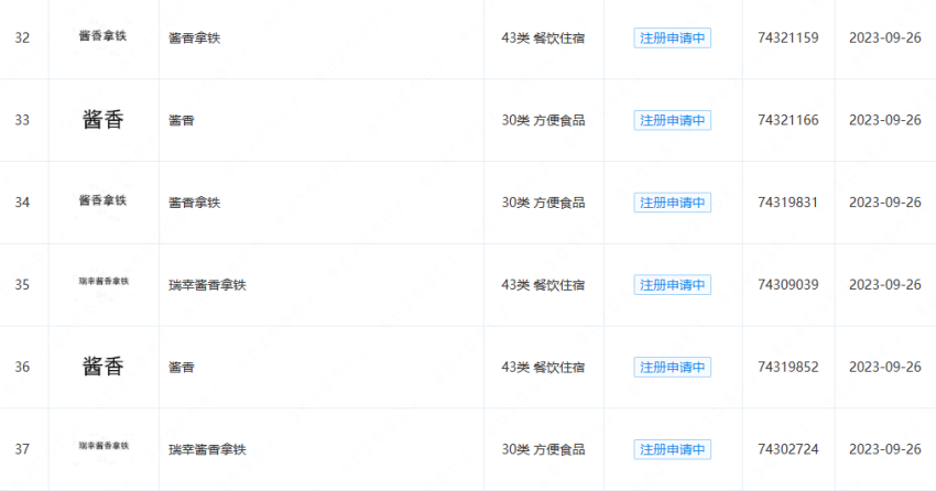 此外,去年“酱香拿铁”的爆火,同样引发一系列商业跟风行为。为了保护自身知识产权,瑞幸咖啡更是在去年9月,联名爆火的同时期申请了多个有关酱香拿铁的商标。截至目前,商标状态仍在“注册申请中”。