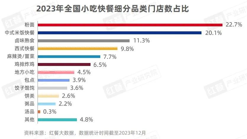 红餐大数据显示,粉面的规模在小吃快餐赛道中最大。粉面品类的门店数在全国小吃快餐品类中位列第一,占比达22.7%。