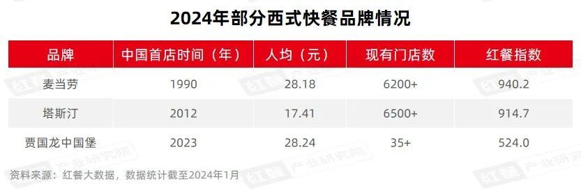 据红餐大数据显示,截至2024年1月,塔斯汀全国门店数已突破6500家;贾国龙中国堡的门店数也超过了35家。