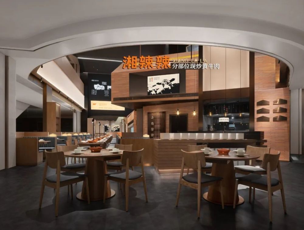 在空间设计上,湘辣辣经历4次迭代。最新的4.0版本以“牛舍”为主题,选用充满热情与活力的橙色为主色调,引入红砖、原木、古铜等元素,整体风格明亮活泼,给顾客营造舒适的环境体验。